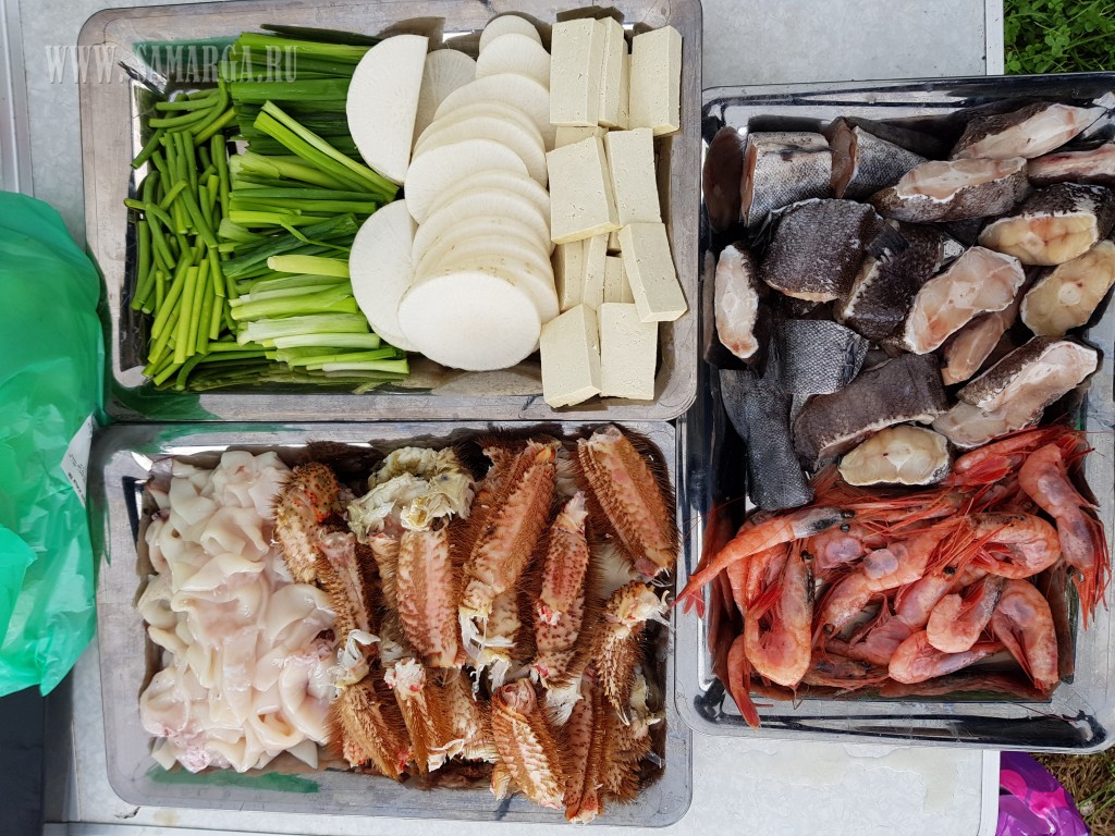Время за работой пролетает незаметно и вот уже пора возжигать печь и приступать к приготовлению корейского супа хемультан из лакедры. Закипела вода, закинули рыбу для подготовления наваристого бульона, следом в суп отправились крабы, кальмар и креветка, дело обретало опититный вид и запах. В последнюю очередь добавили овощи и зелень, заправли острым соусом и оставили настаиваться, подходило время возвращения команд.