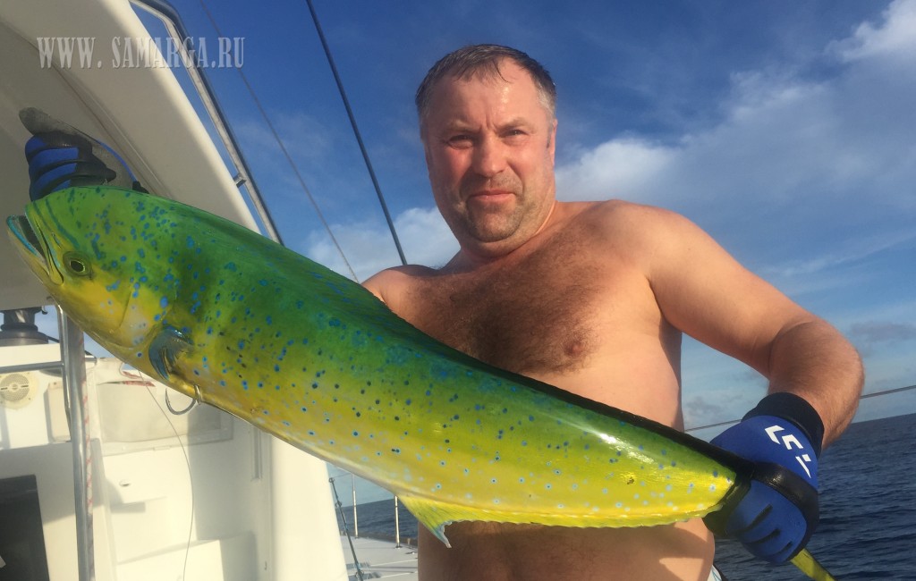 Уже за полночь мы приходим на место якорной стоянки на край Ower bank. Те, кому удалось поспать на переходе, уже готовы замочить снасти. Установили прожектор на корму, яркий свет быстро собирает планктон и мелкую кормовую рыбу вокруг. На границу светового пятна подтягиваются каракатицы и мелкие хищники, в основном не крупная баракуда, она нас интересует меньше всего, а вот королевская каракатица наш клиент! Каракатица хорошо клюет на кастинговые кальмарницы, светонакопительные и медленно тонущие. Сейшельская рыбалка началась. Размер с доброго дальневосточного кальмара, вот только чернил гораздо больше. В общем, к первым лучам солнца корма нашего белоснежного лайнера была здорово ухезана. С рассветом уже вся команда была в строю. Не считая каракатиц и ночных баракуд, счет открыл Валерий Б. За несколько минут он поднял на борт несколько очень ярких и красивых Дорад. Счет открыт! Еще несколько догтусов на кастинг порадовали наших рыбаков, размер не крупный 12-15 кг, на джиг амбержеки и елоуфины (желтоперый тунец). Утрянка закончилась и мы в поисках перспективных мест отправляемся по просторам Индийского океана. На обед решили приготовить свежайший улов на гриле.