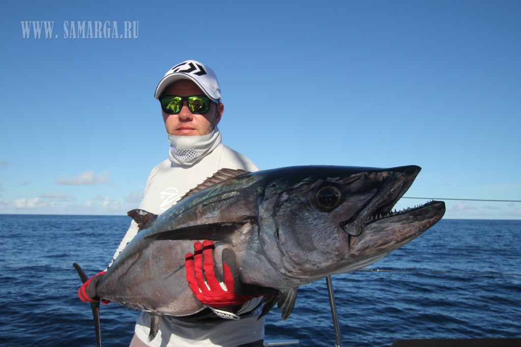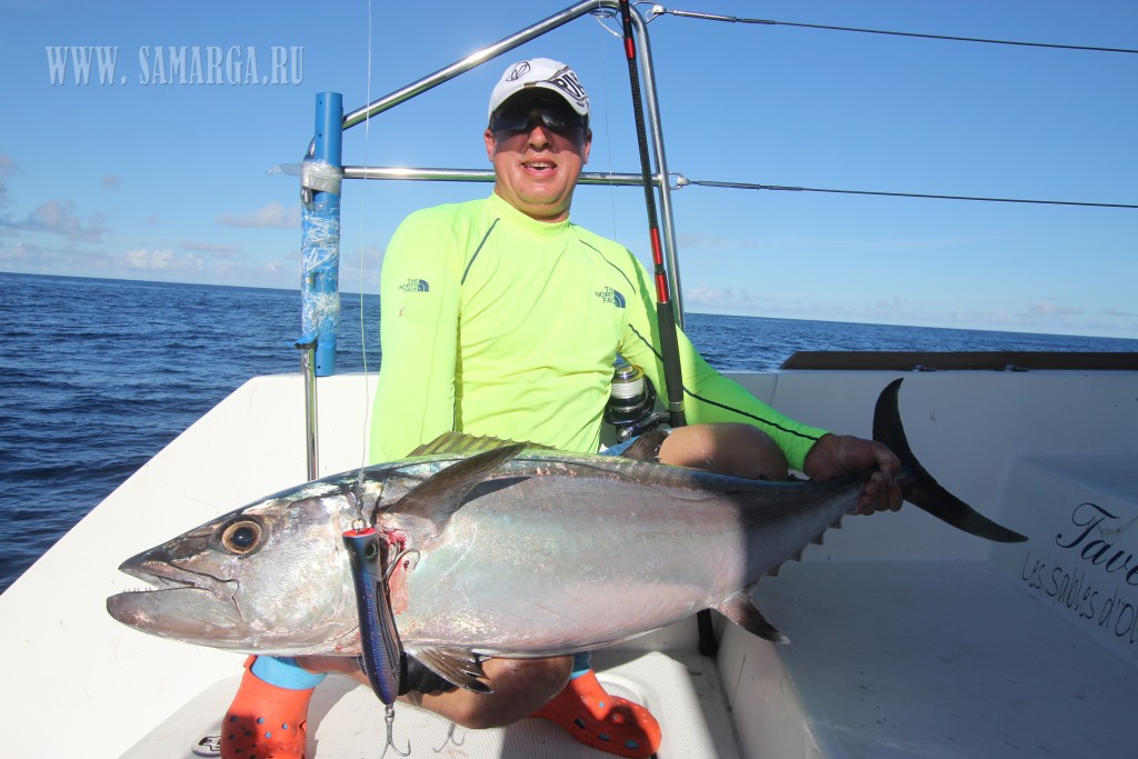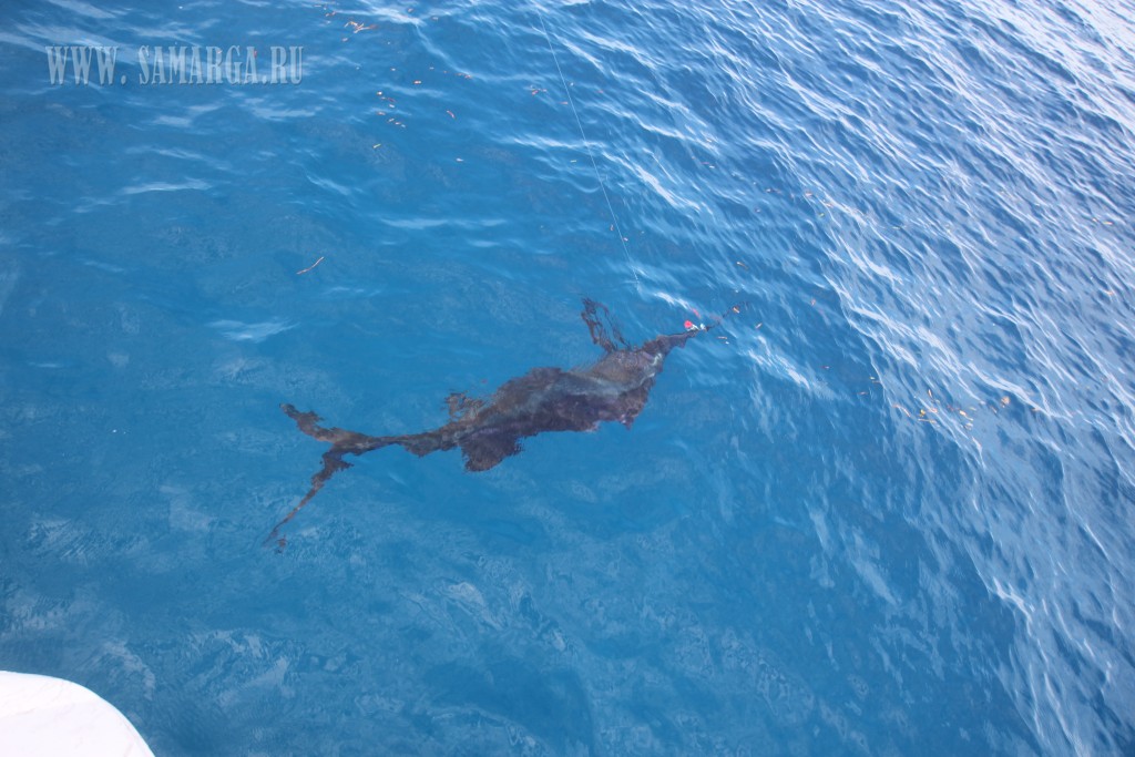 Вернемся на Сейшелы, вечером после рыболовного дерби нашу команду ждал первый конфуз :o . Как оказалось вечером наш запас пресной воды иссяк . Как выяснилось позже виной тому не включенный опреснитель и невозможность некоторых экспедиционеров отказаться от привычки несколько раз в день принимать душ .Вторым конфузом о котором мы узнали уже утром, так это то что один из двигателей не дает зарядку бортовым аккумуляторам .Самостоятельно обнаружить и устранить причину не удалось .Ко всему еще и неблагоприятный прогноз по погоде о котором сообщили капитану. Было принято решение рыбачить до обеда и возвращаться в порт для устранения неполадок . На утрянке удалось поднять первого GT, несколько желтоперых , джобов, дорад и другой разно рыбицы , работал кастинг . Около 10 утра когда клев вроде бы стих я решил покидать стик , буквально в первую проводку за приманкой вышел хороший догтус как черно серебристое пятно выскочил из глубины, промазал и ушел восвояси . Через несколько забросов я увидел атаку своей приманки и преследующий ее плавник, мне показалось что это акула и дабы избавить от не нужной поклевки я начал быстро выматывать приманку и когда практически в нескольких метрах от борта я опять заметил преследующую тень я попросту вырвал приманку из воды, как я опешил когда прямо под бортом я отчетливо увидел парусника расправившего свой верхний плавник .Ошибка которая стоила мне прекрасного трофея . Больше этот красавец на мои забросы не отозвался .Дело было к обеду и капитан направил наш катамаран в сторону порта .