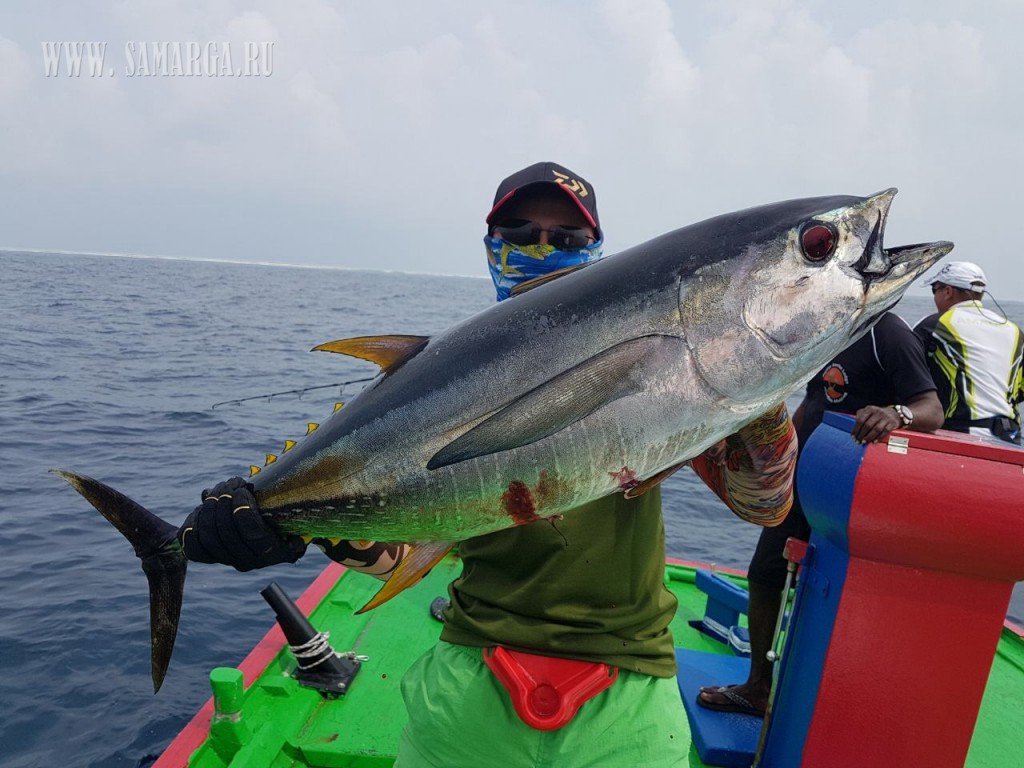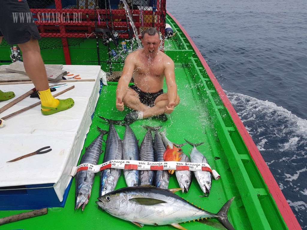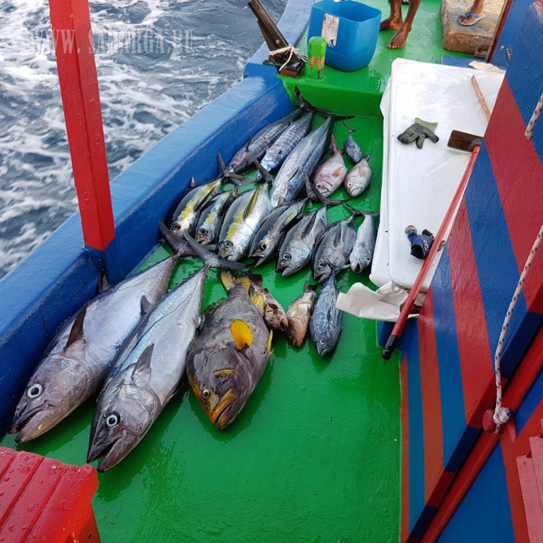 Дополнительный день рыбалки: После таких сходов и обрывов хороших размеров рыбы. Несколько человек из нашей группы, изъявили желание (за отдельную плату) пойти на рыбалку в день вылета домой. Пошли, конечно же, за крайний атолл. Итог: 6 Ваху, 1 Желтоперый Тунец весом около 16 кг. 2 Сабакозубых Тунца, Акула более 2 метров, несколько Групперов. По словам парней, они наблюдали «заварки» подходящего крупного Желтоперого Тунца, которого мы так ждали, но время нахождения нас на Мальдивах подошло к концу, досадно конечно, но есть стимул вернуться и наверстать упущенное.