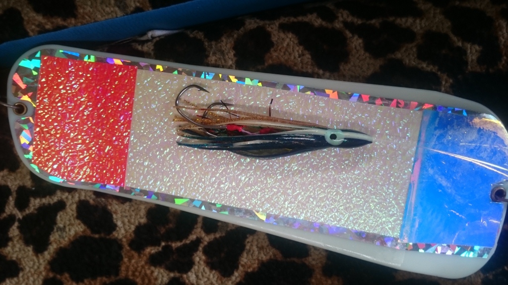 Обычно процесс происходит в определенной последовательности: пришел на рыбное место, скинулся, подобрал глубину и снасти, и начал ловить, но не в это день. Как уже упоминал в предыдущей статье, на точке лова стараюсь оказаться с рассветом, так и сегодня, в 6.10 снасти уже были заряжены. Все как обычно, самый рабочий комплект флэшеров и приманок был заряжен и отпущен на глубину в определенной последовательности. Прошел час,-ни поклевки, звоню товарищу,который рыбачит соседним бортом ,отвечает-взял две на зеленого октопуса, заряжаю октопуса и сразу сход, заряжаю на вторую фиолетового, и снова сход,и опять сход, после еще час ни поклевки. Думаю, ну ерунда,только 8 утра, перехожу на следующий мыс,поклевка-на борту,еще поклевка-на борту,после сход, снова сход,еще один сход и полная тишина в эфире в продолжение двух часов. Перезванивает товарищ,+6на борту, а у меня всего две и масса нереализованных поклевок,значит что-то я делаю неправильно. В моем арсенале, примерно два десятка рабочих флэшеров и около 100 приманок, к 11.00 удалось перепробовать 80% этого добра. Причем, все это происходило монотонно и последовательно, нервы начанали сдавать.На блесна,каракаты и кохи рыба вообще не клевала ,а вот резину(темно фиолетовый октопус с красной подбивкой и золотисто фиолетовый со светонакопителем) стала брать агрессивно, даже разорвала один из октопусов. После того, как удалось подобрать рабочие снасти, не произошло ни одной холостой поклевки и не одного схода!