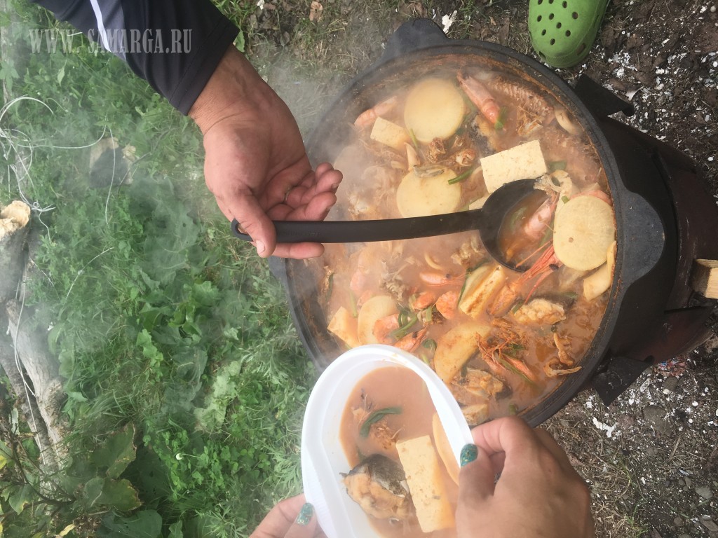 Время за работой пролетает незаметно и вот уже пора возжигать печь и приступать к приготовлению корейского супа хемультан из лакедры. Закипела вода, закинули рыбу для подготовления наваристого бульона, следом в суп отправились крабы, кальмар и креветка, дело обретало опититный вид и запах. В последнюю очередь добавили овощи и зелень, заправли острым соусом и оставили настаиваться, подходило время возвращения команд.