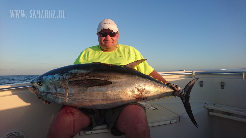Мой хороший знакомый Алексей П. сейчас находится в Испании и охотится на BFT или синеперого тунца . Еще весной он приглашал меня на эту рыбалку, но к сожалению обстоятельства сыграли против и я не смог составить ему компанию . Вчера рыбачил первый день, и вот что он пишет :писать сил нет, спину сорвал. Этот с боку рта зацепился - капец, думал умру. Жалко его - пока вытаскивал подох, пришлось выкинуть (40-43 кг, около 2000 EUR закупочная цена). Кэп не в