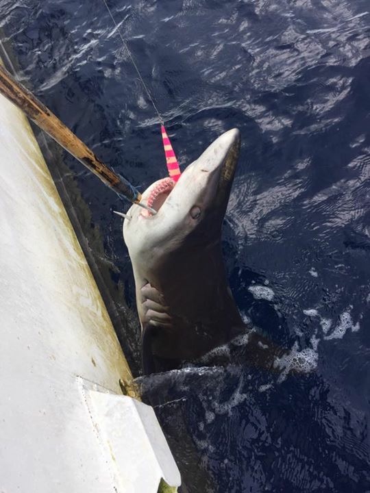И вот все-таки рыба под поверхностью, и уже все рыбаки лицезреют ее. По-моему это лимонная или бычья акула, около 2,5-3 метров в длину. Она абсолютно не сдалась и нарезает круги под поверхностью, мне раз за разом приходится подводить ее к судну, чтобы кто-то из команды взялся за шок лидер. Ну вот вроде бы решение принято и боцман приготовил петлю, но как только веревка падает ей на голову, акула резким рывком уходит под судно и об корпус рвет шок лидер. В принципе оно и к лучшему, Хотя мы остались без фото, а команда без дополнительного заработка, но мы не нарушили баланс ихтиофауны и не загубили вершинное звено пищевой цепочки.