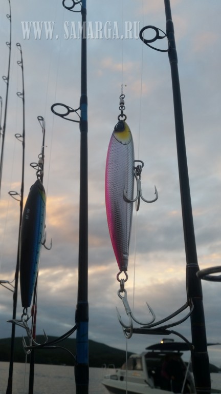 Пока одни команды гонялись за котлами, другие активно джиговали в районе острова Карамзина. Джиггинг был изобретен в Азии и этот способ ловли заключается в проводке металлической приманки имитирующей рыбку от дна до борта лодки. Учитывая глубину и вес приманки, это рыбалка требует хорошей физической подготовки. Увы, активный джиггинг не дал результата, либо рыбы поднялась на поверхность, либо ей не нравились приманки.