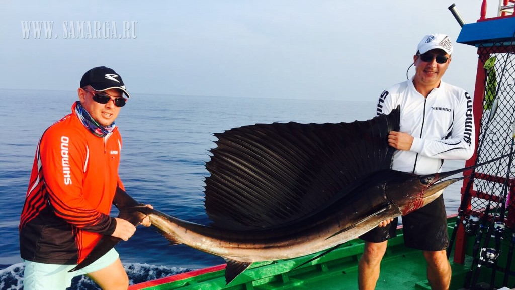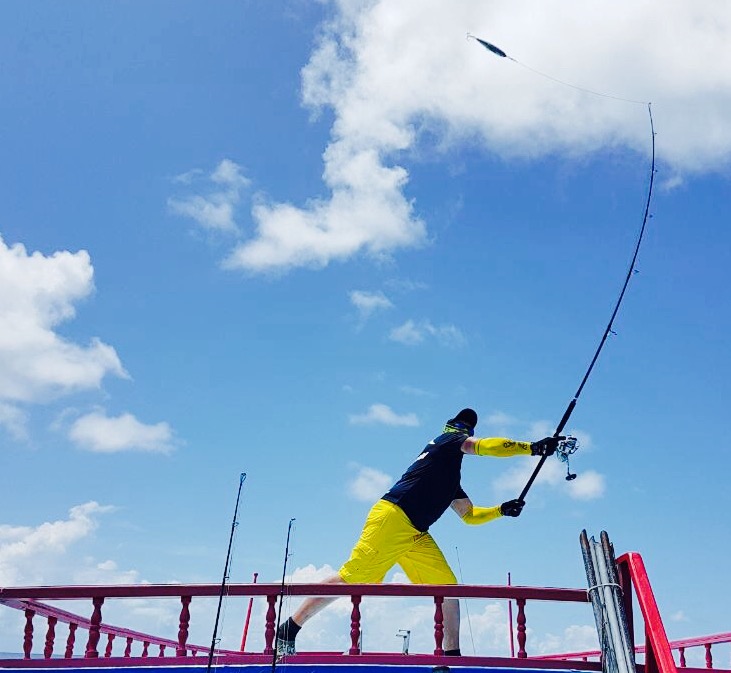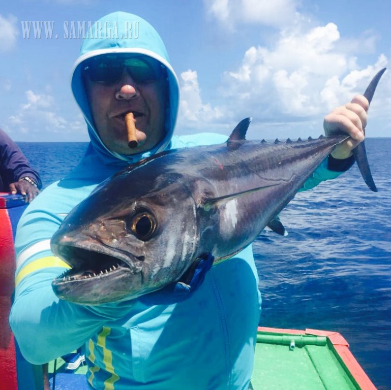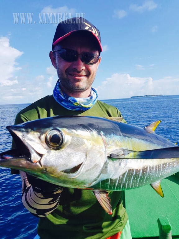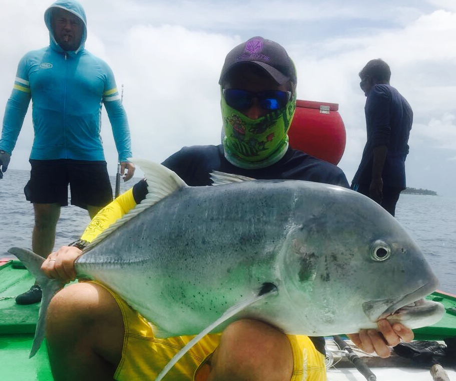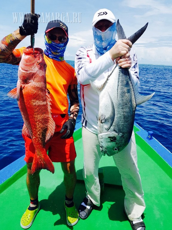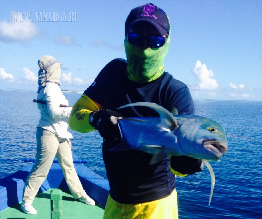 Пройдя около 40 минут, капитан подошел к первому атоллу, прозрачность воды просто завораживает, погода безветренная, полный штиль. (Погода не для рыбалки, а для отдыха), делаю несколько забросов Поппером Halco (цвет зеленый), молодь разбегается в стороны, выходов хищника нет. Сменив несколько мест, Алексей с верхней палубы судна делает хороший заброс и его стик (Shimano 160 F) четко попадает на линию свала. Из вне «вылетает» GT (Giant Trevally) и атакует приманку, началась борьба, примерно 10-15 минут борьбы, визга фрикциона и криков Алексея. И вот она! Первая наша рыба на борту. GT хорошего размера около 25 кг. Фотосессия с трофеем. К огромному сожалению, из-за того что рыба очень глубоко заглотила приманку и повредила себя, спасти ее не удалось, как мы не старались. После нескольких забросов у меня садится на стик (Shimano OCEA PENCIL 220 F), который был куплен в крайней поездке в Японию. GT не крупный (голубой) около 5-7 кг. У двоих наших ребят пока не получается взять рыбу. Через некоторое время у Натальи на стик M&W (розовый-серебро) вышел Желтоперый Тунец около 1 метра длиной, сопроводил его до лодки, но не атаковал. Не хватило опыта (по проводке). После этого я также на (Shimano 220 F) взял еще два GT весом около 10 кг. К 12 часам перекусили и снова в «бой». Делаю хороший заброс, точно попадаю на грань свала, проводка и вот она, атака GT хорошего размера. Просекаю, по фрикциону (настроенного примерно на 15 кг.) понимаю, что на том конце достойная рыба. После отработки фрикциона, вымотав около 50 м. рыба встала как плита, не уходит и не поддается на поверхность. Удерживая рыбу пару минут она стала уходить на глубину, вымотав еще около 20 м.